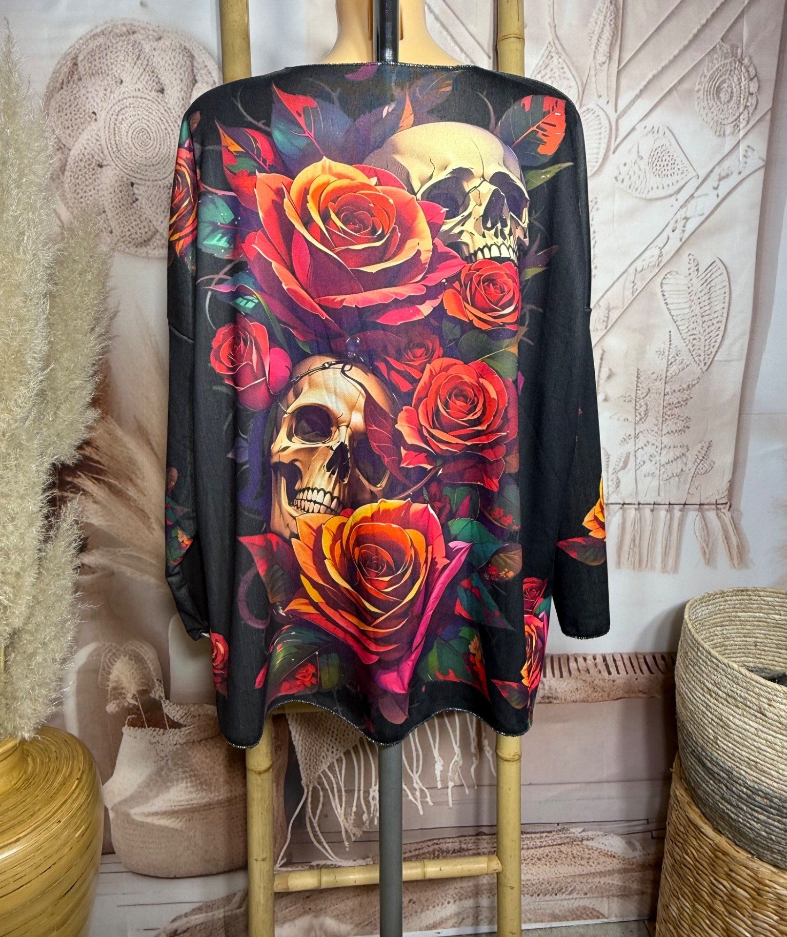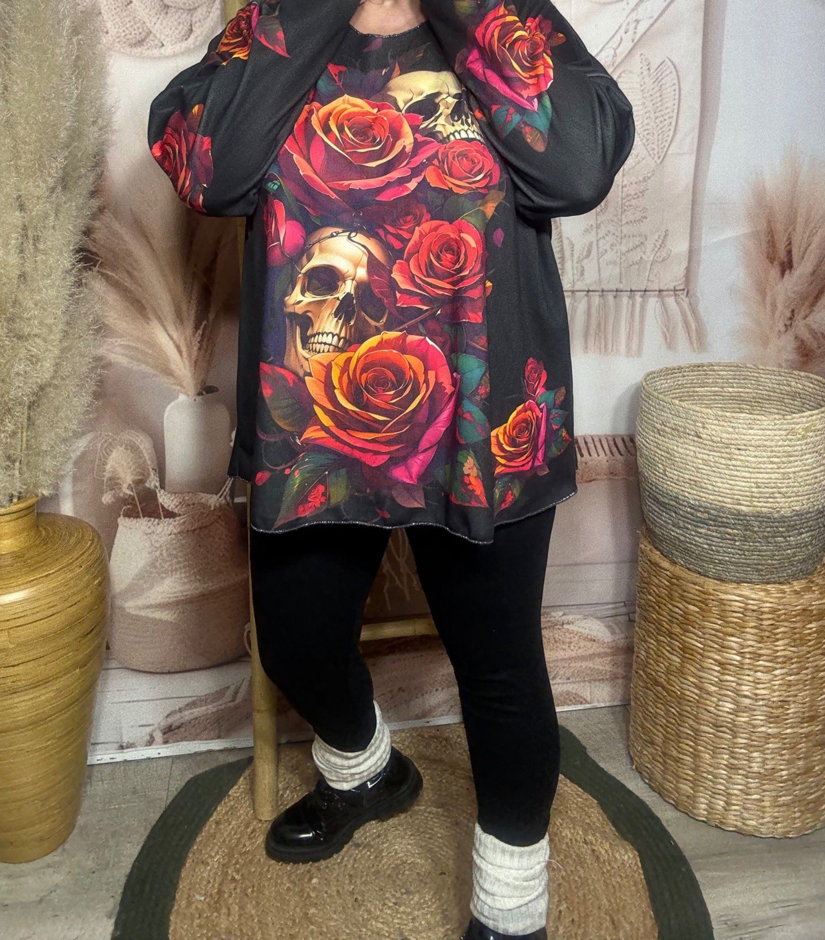 Top noir doublé fine polaire Mexican Skulls & Roses douceur +++