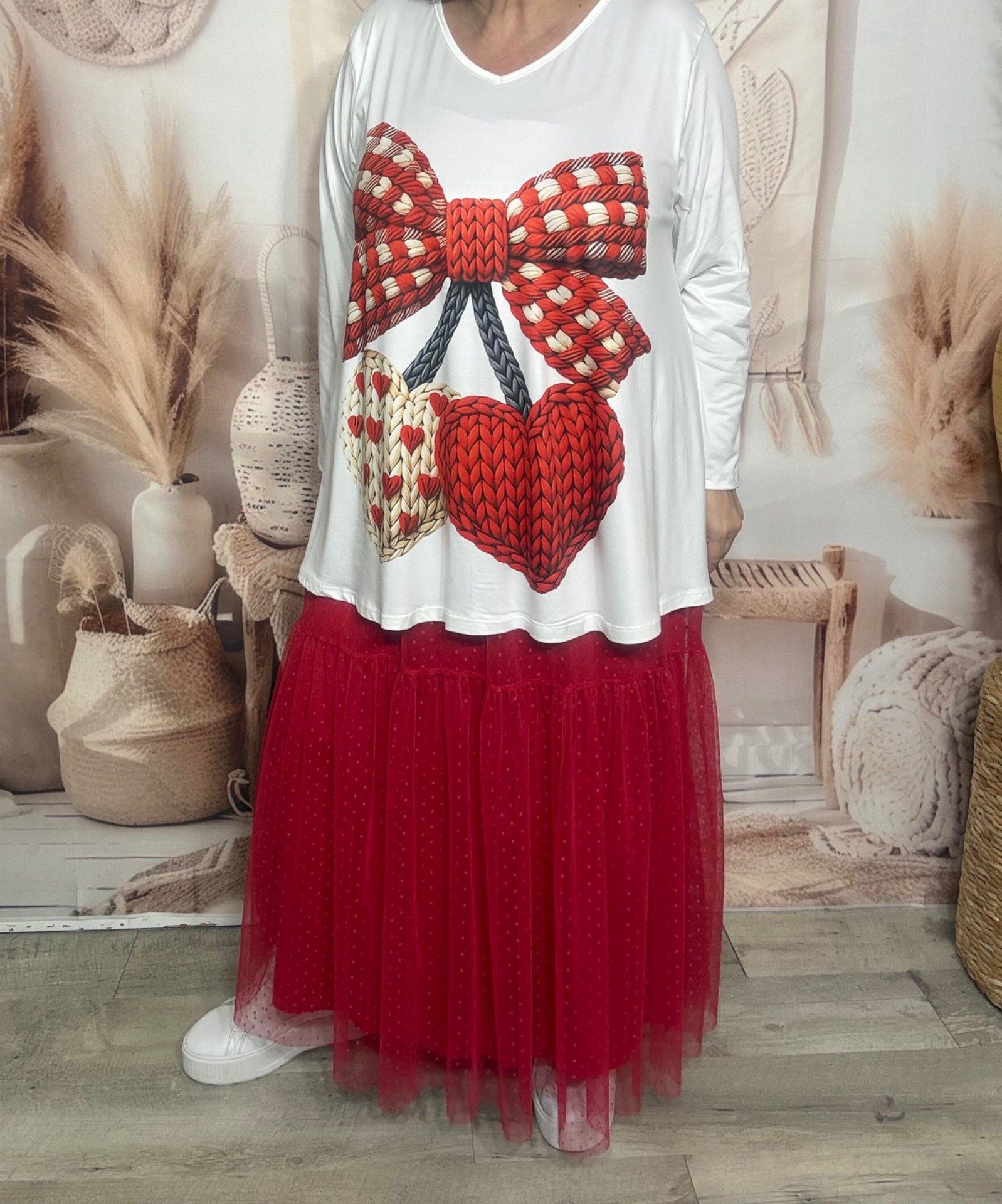 Top trapèze blanc manches Les Cerises tricotées en coeurs du 40 au 54/56