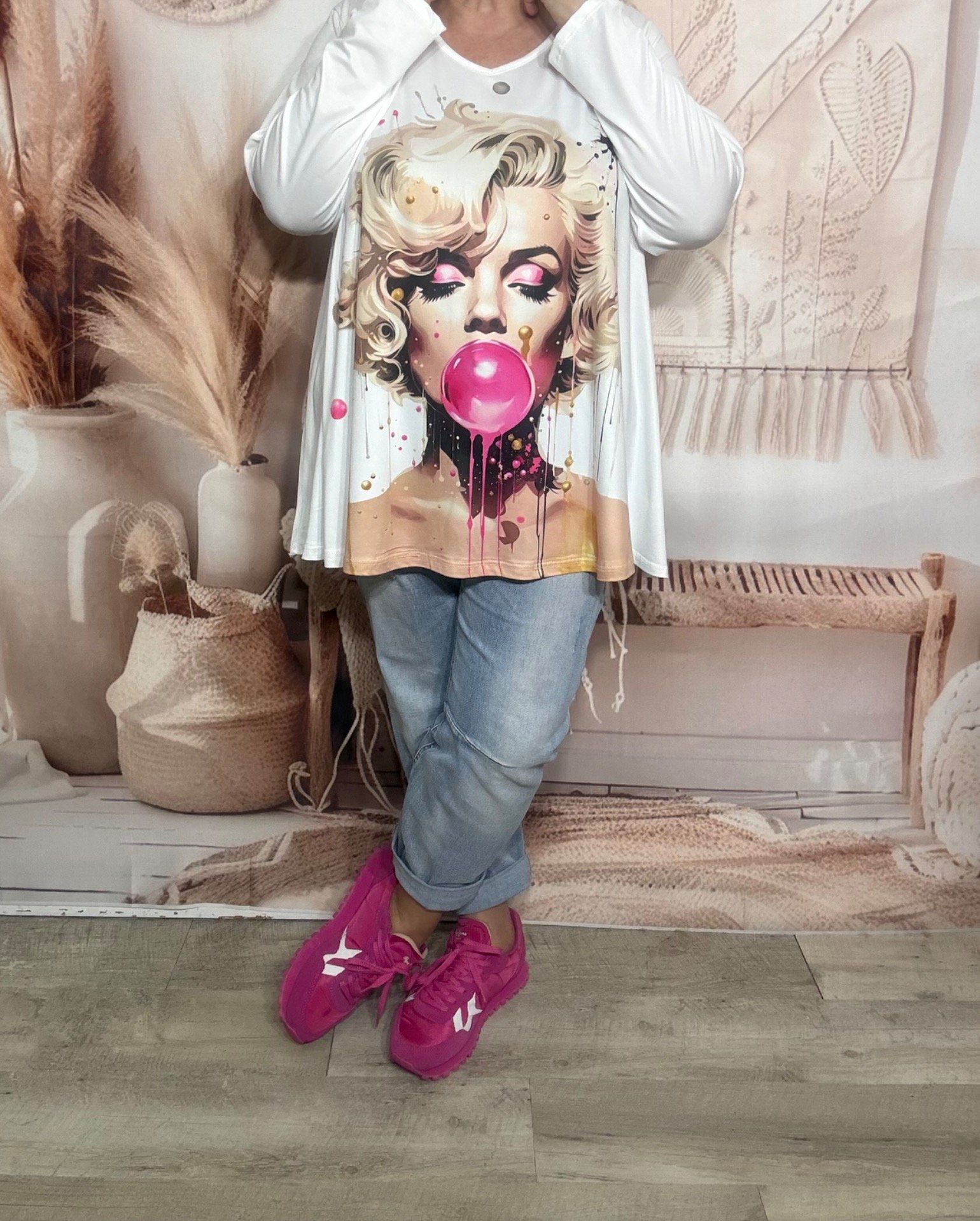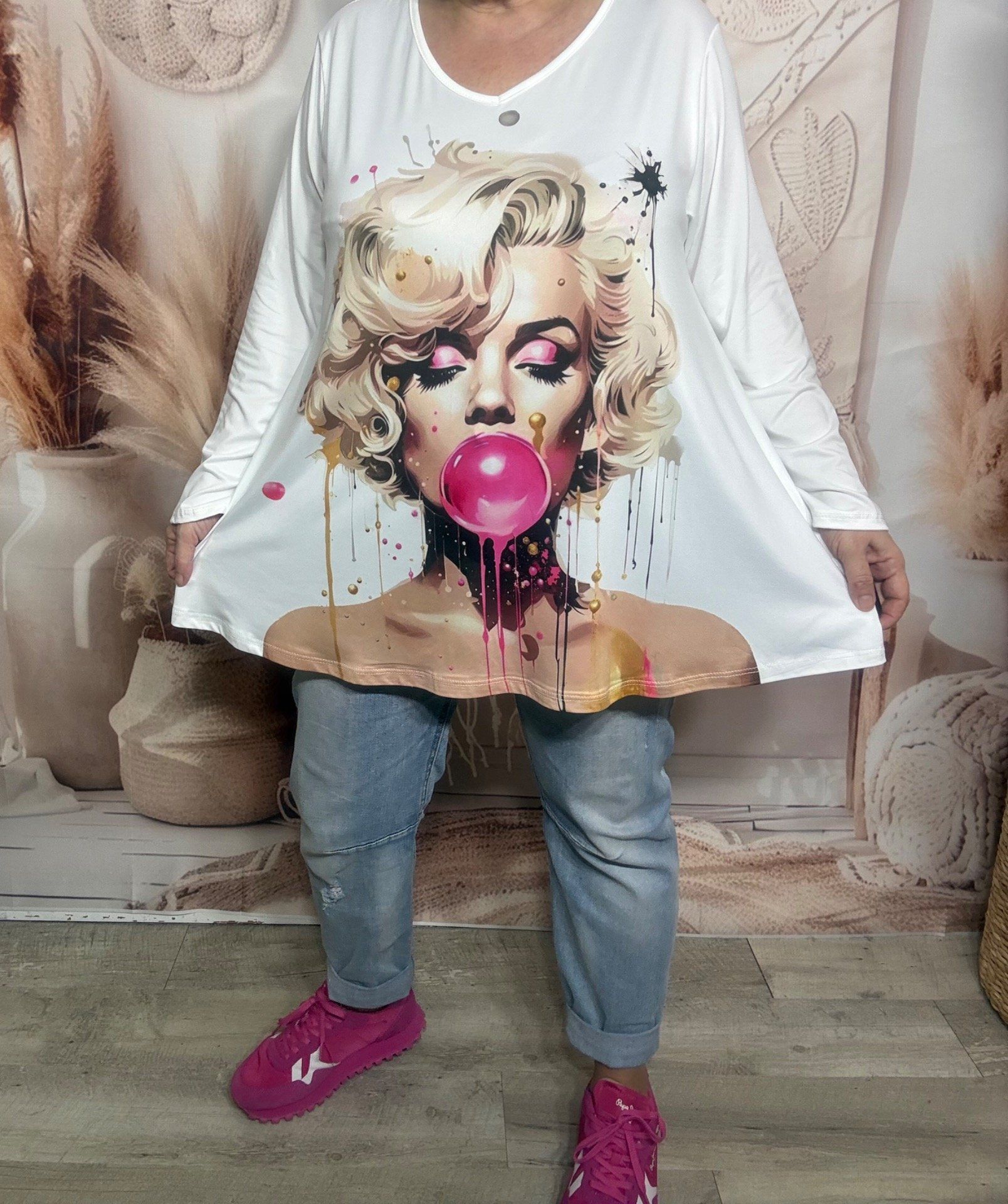 Top trapèze blanc manches longues Marylin Monroe Bubble Gum
