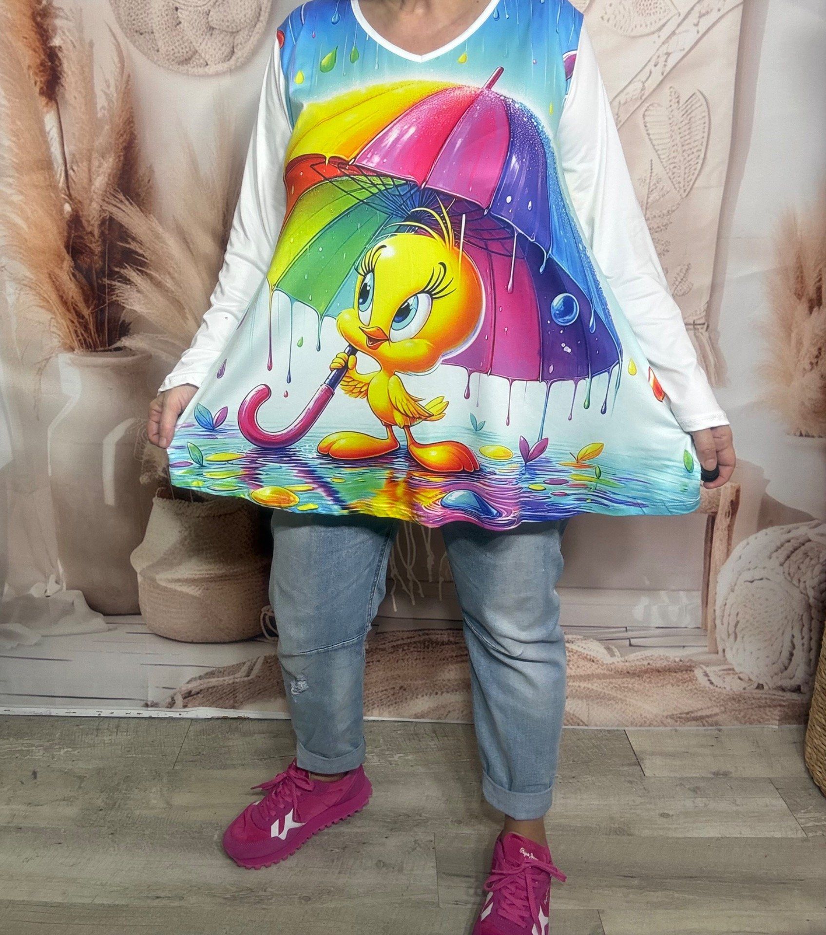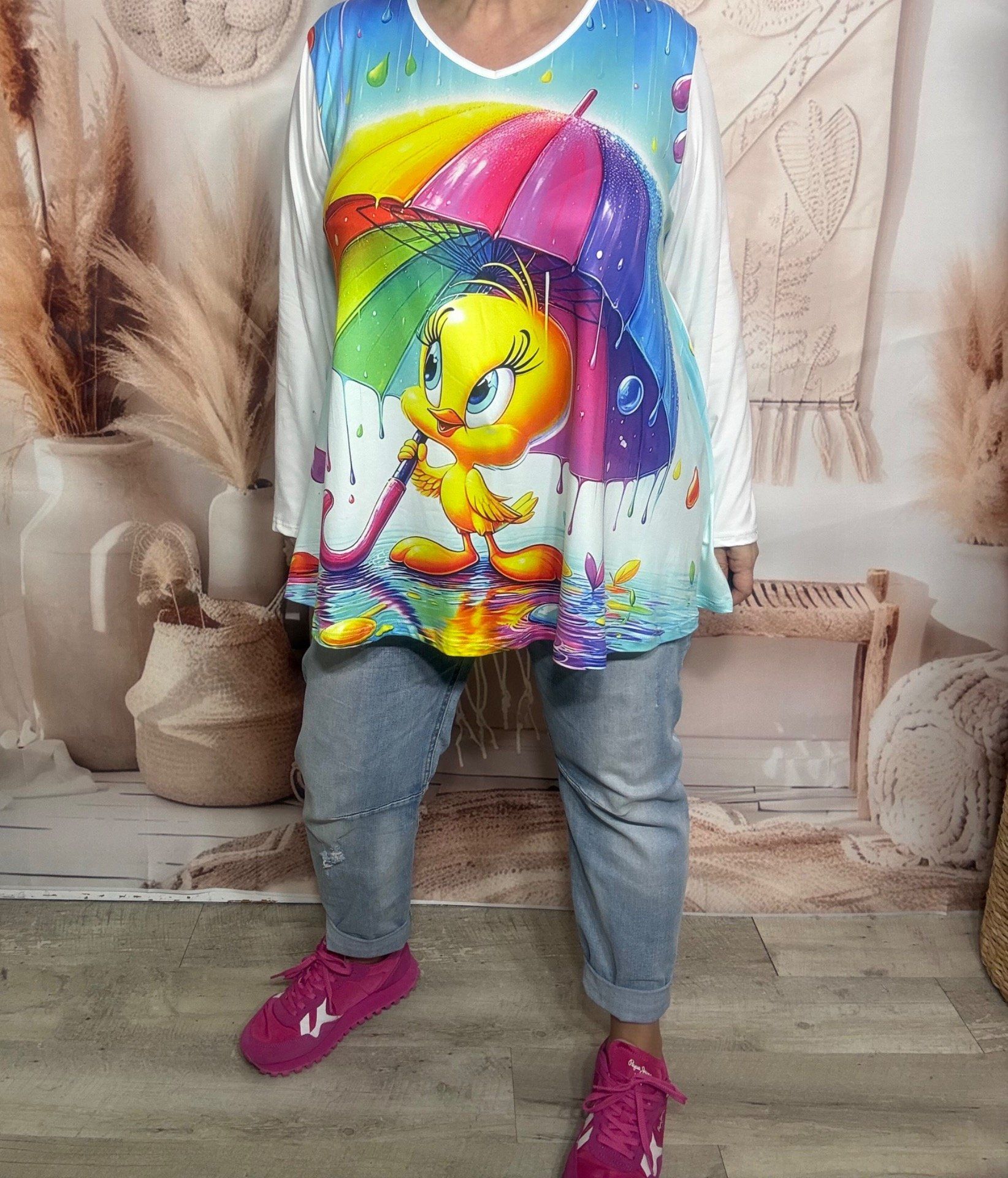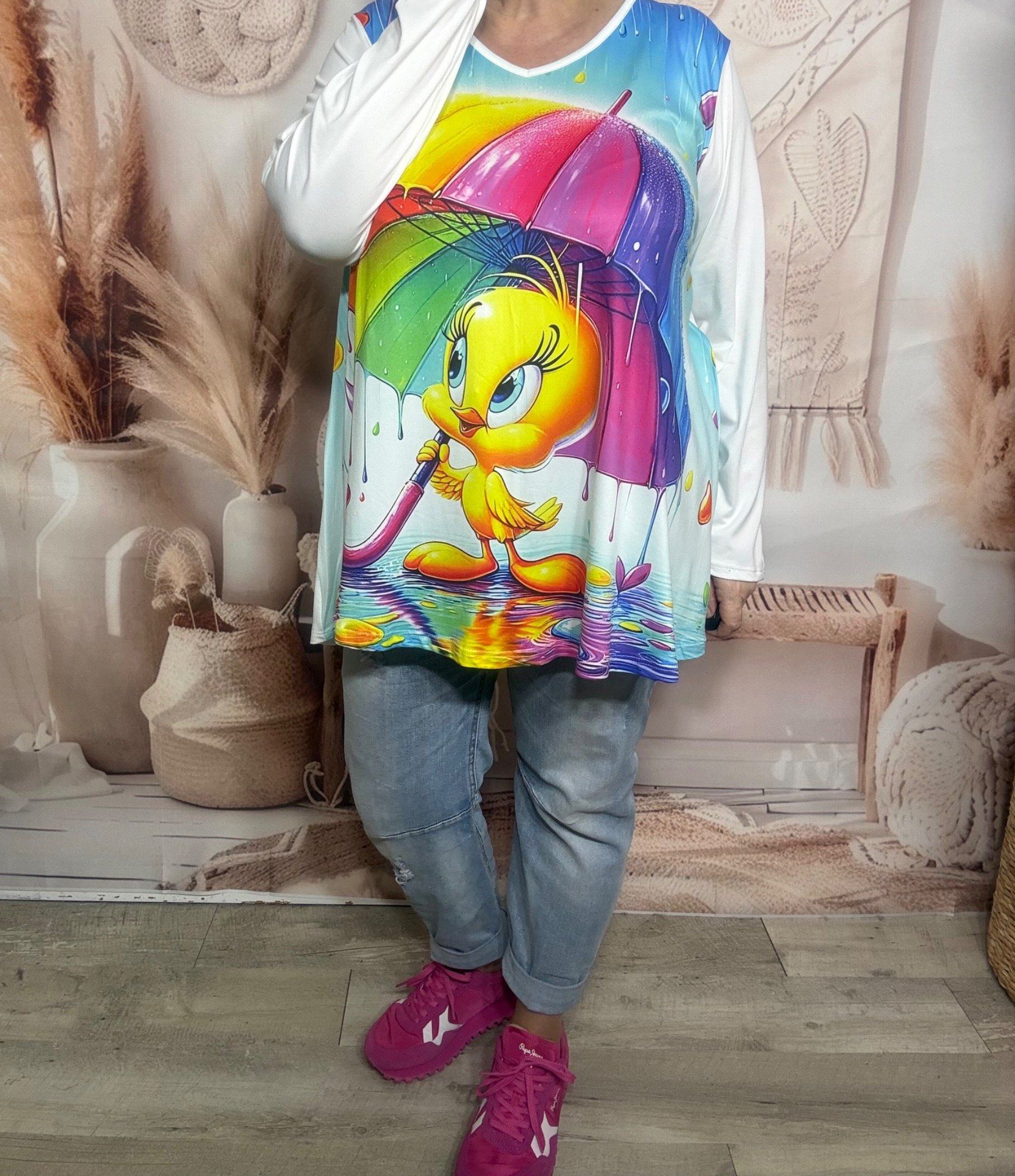 Top trapèze blanc manches longues Titi sous son parapluie Arc-en-ciel du 42 au 56/58