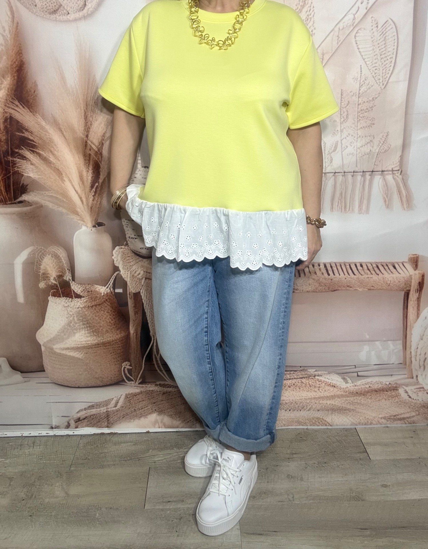 Top trapèze jaune pastel volants broderie anglaise blanche douceur +++