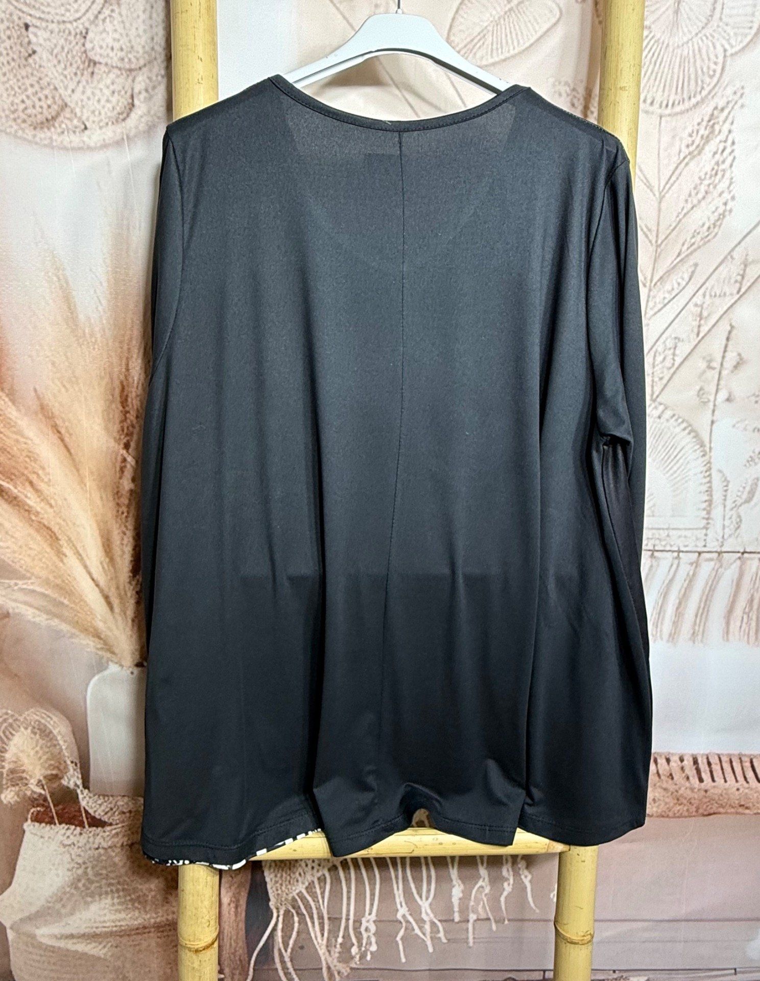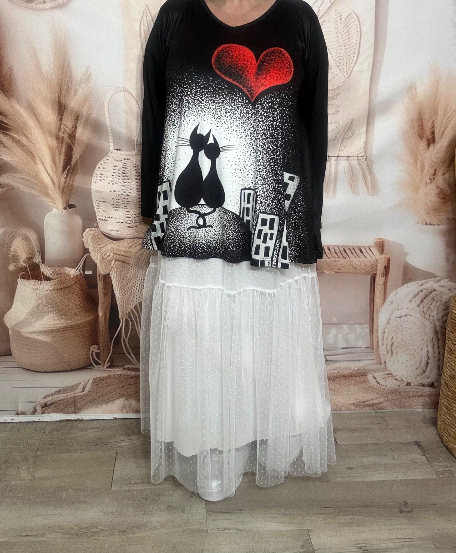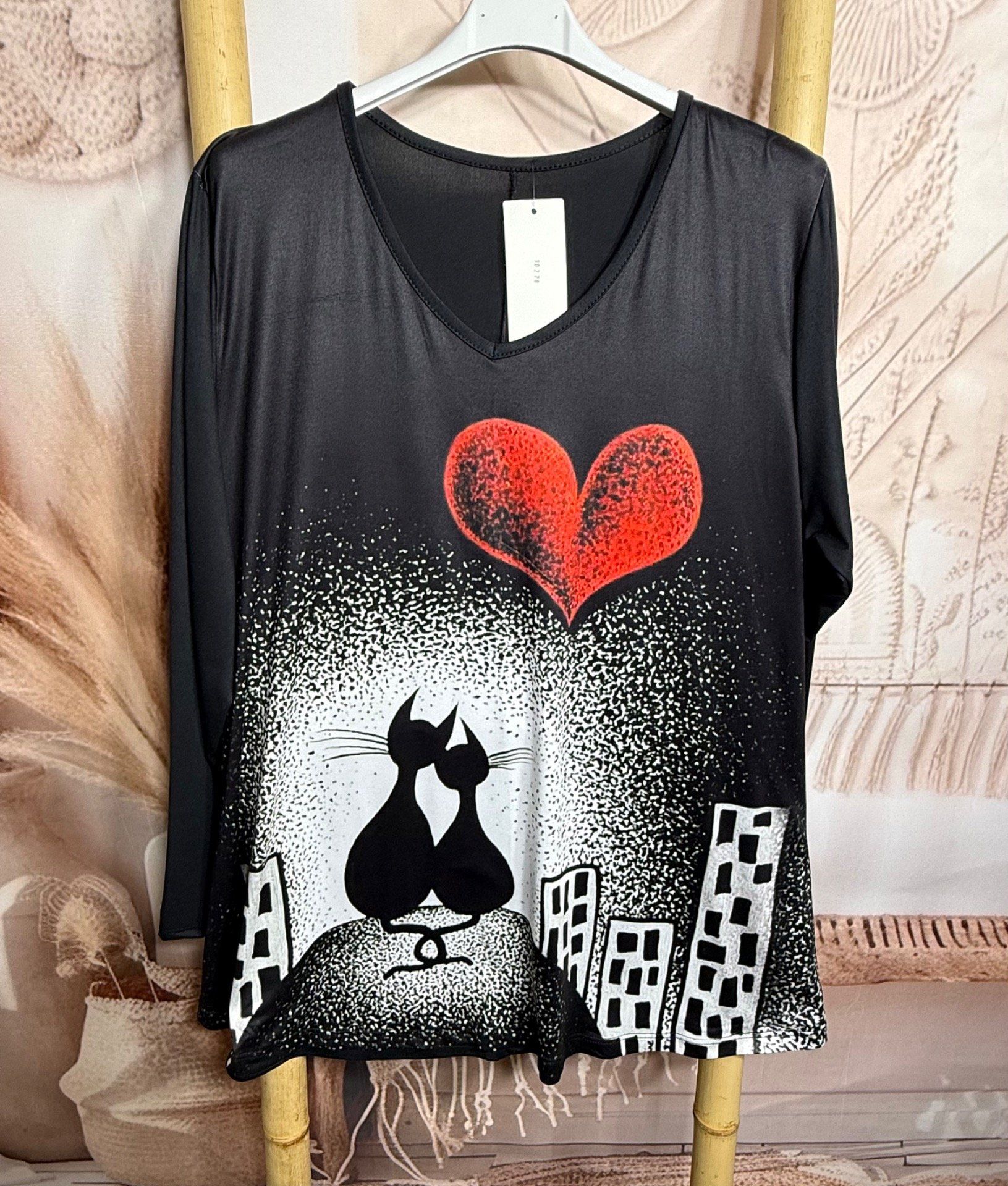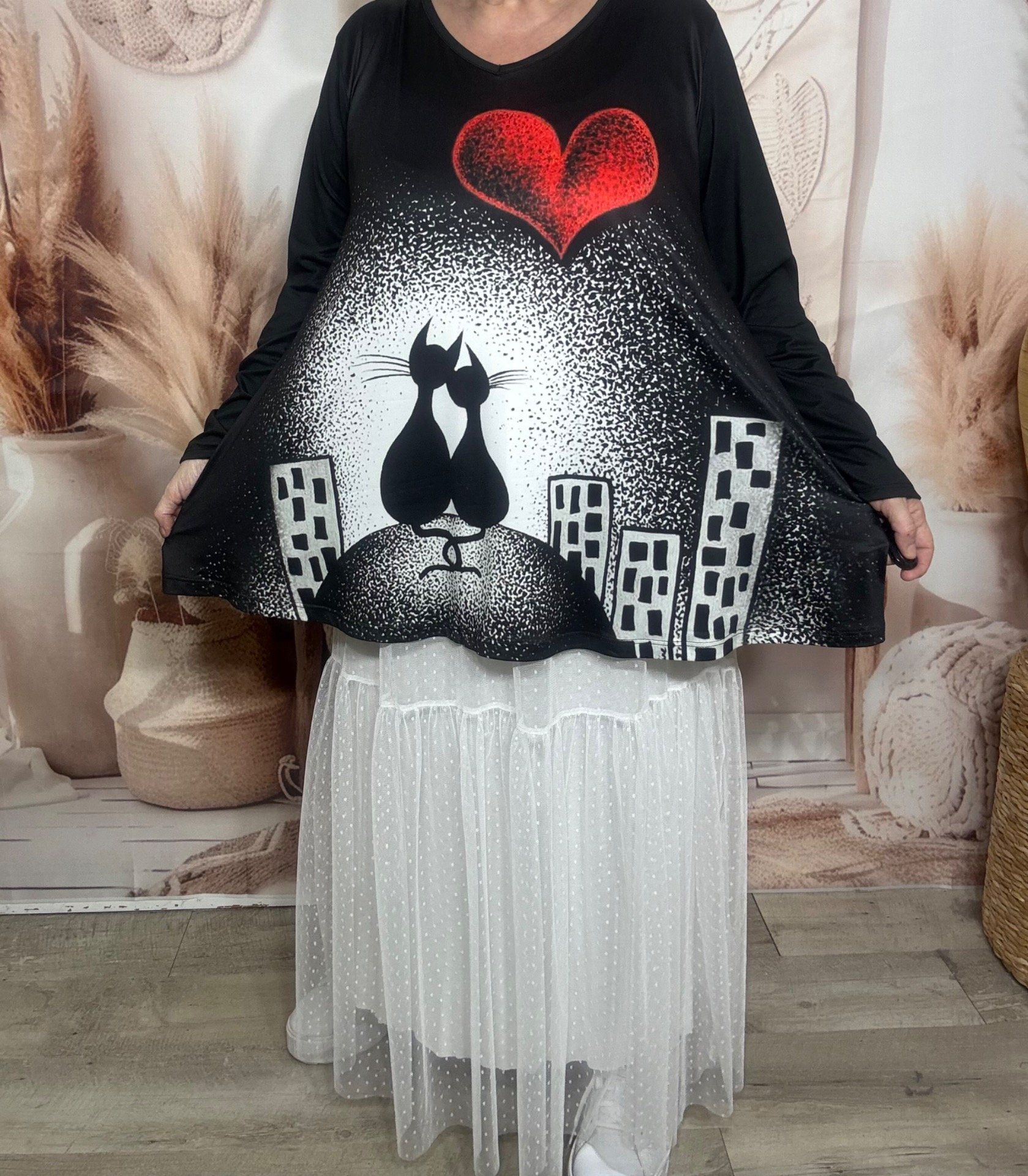 Top trapèze noir manches longues Les Chats amoureux au clair de Lune du 40 au 54/56