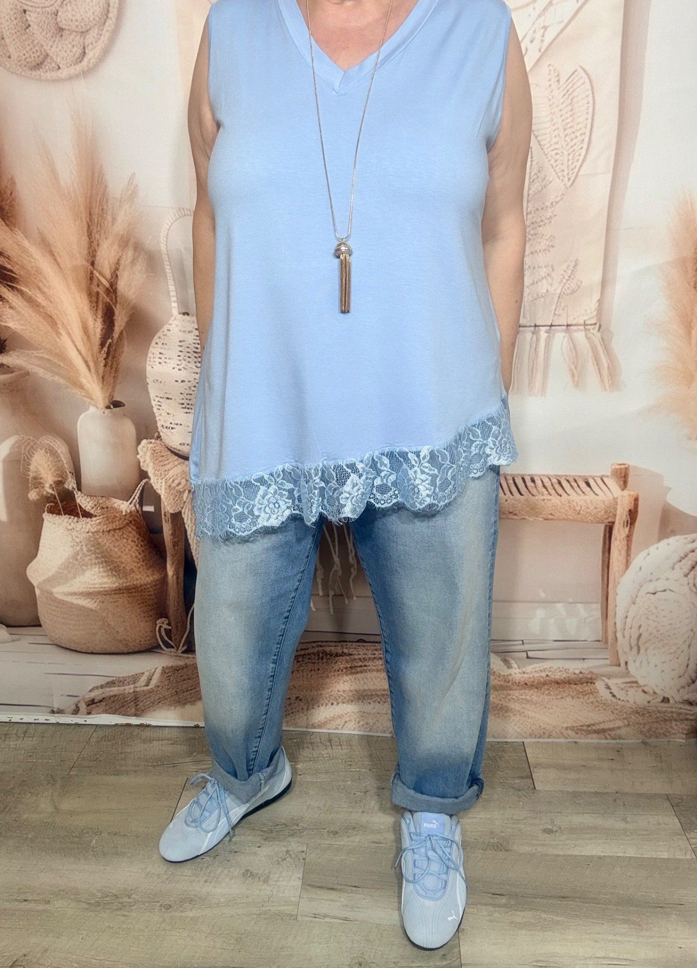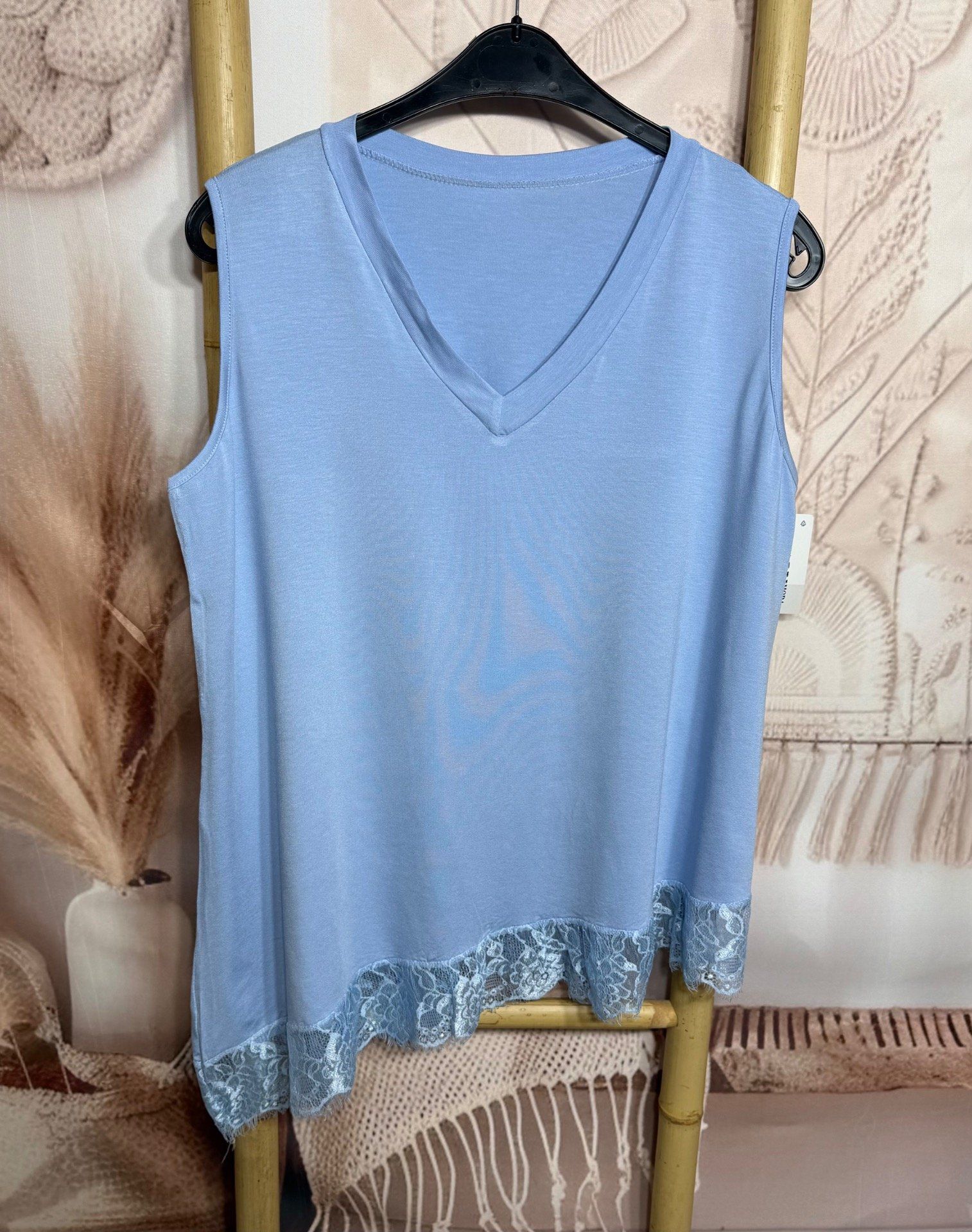 Top trapèze sans manches asymétrique bleu ciel dentelle Les Basiques du Dressing du 40 au 52
