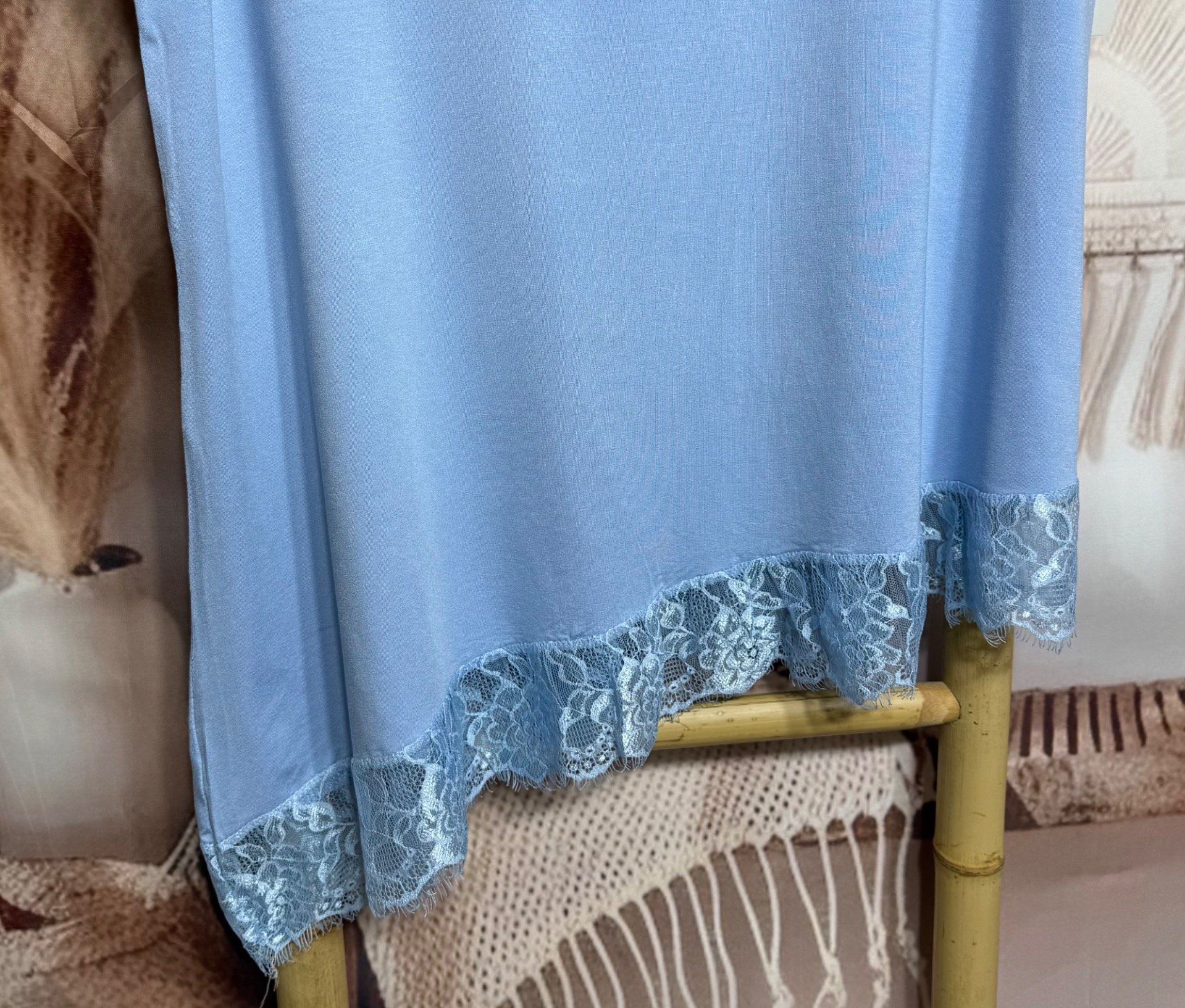 Top trapèze sans manches asymétrique bleu ciel dentelle Les Basiques du Dressing