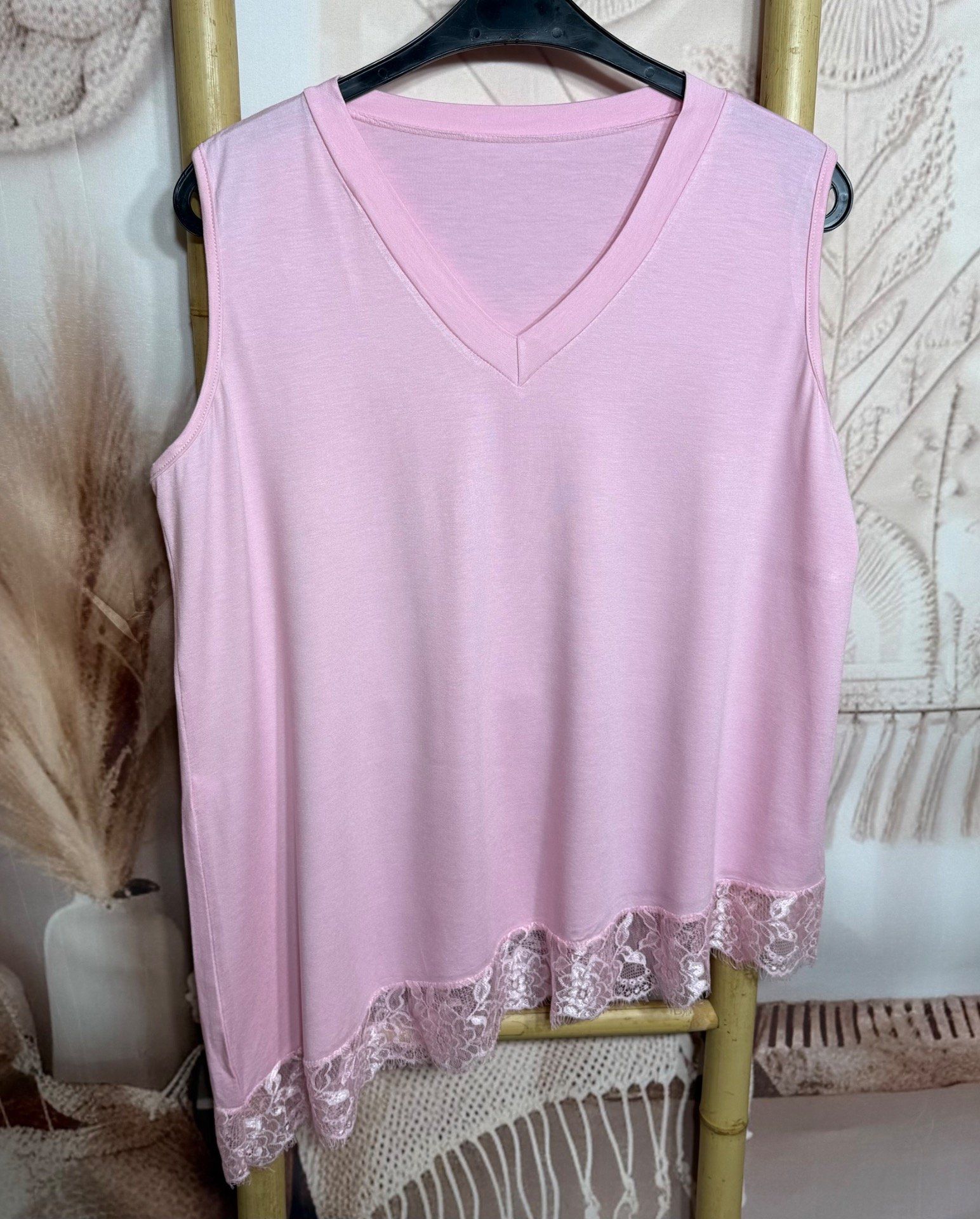 Top trapèze sans manches asymétrique rose bébé dentelle Les Basiques du Dressing