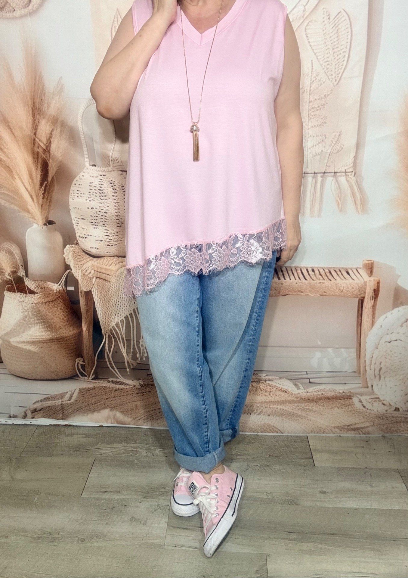 Top trapèze sans manches asymétrique rose bébé dentelle Les Basiques du Dressing du 40 au 52