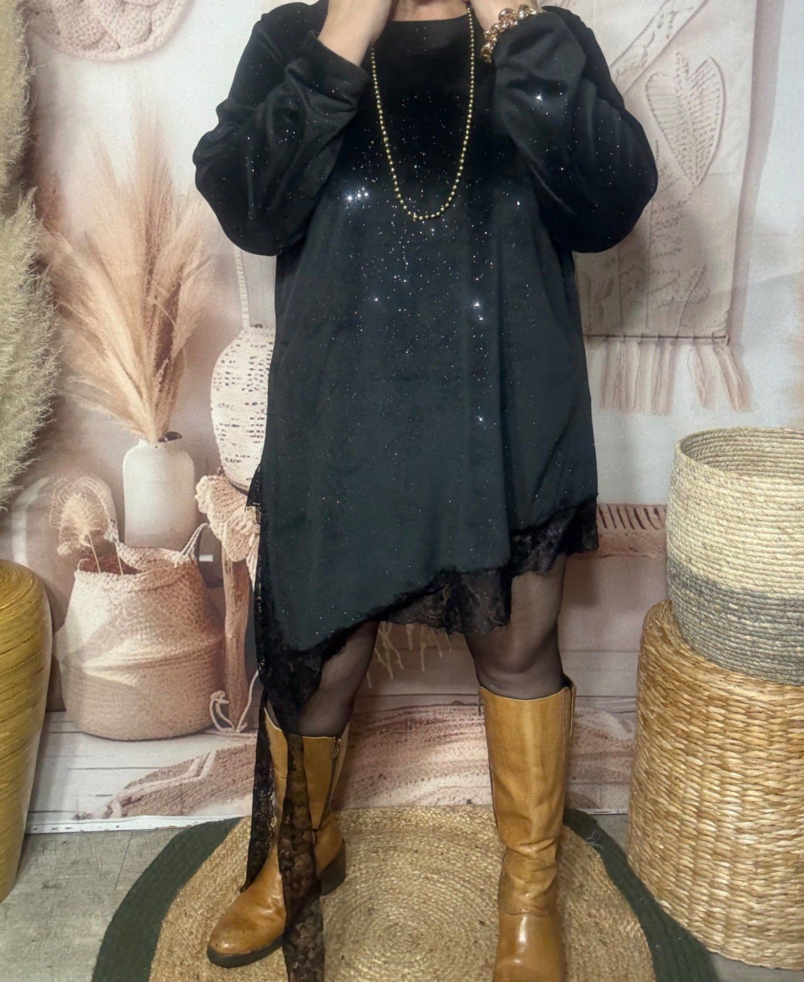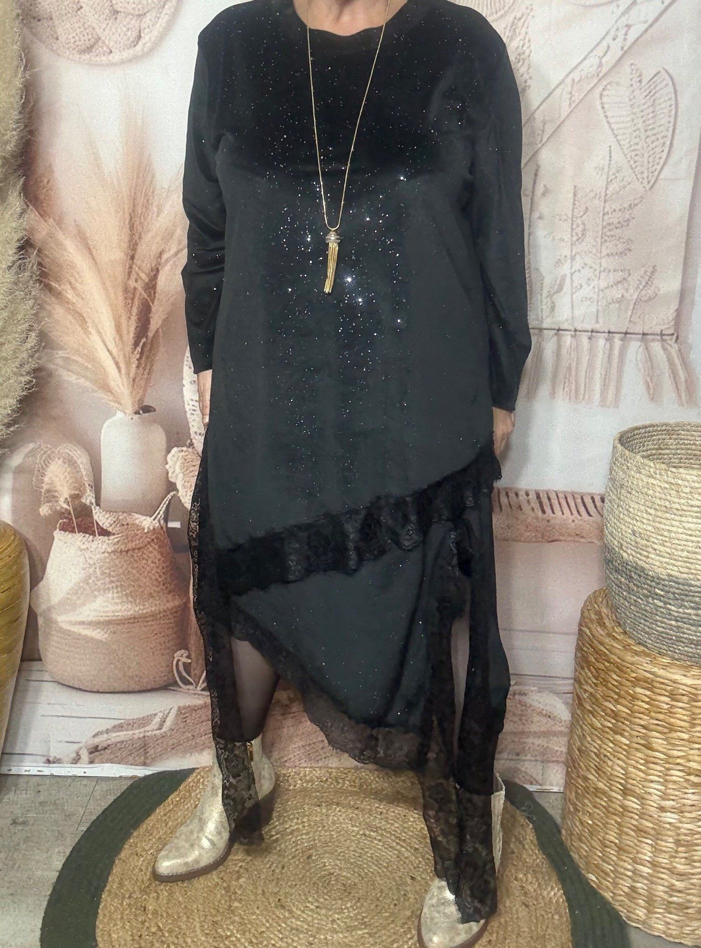 Tunique asymétrique velours ras noir strass paillettes argentées et dentelle noire du 38 au 50/52