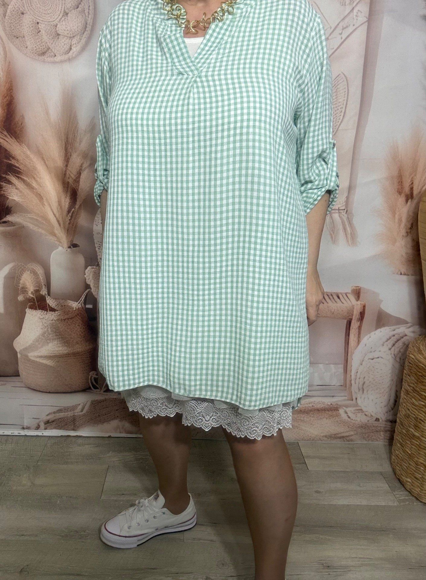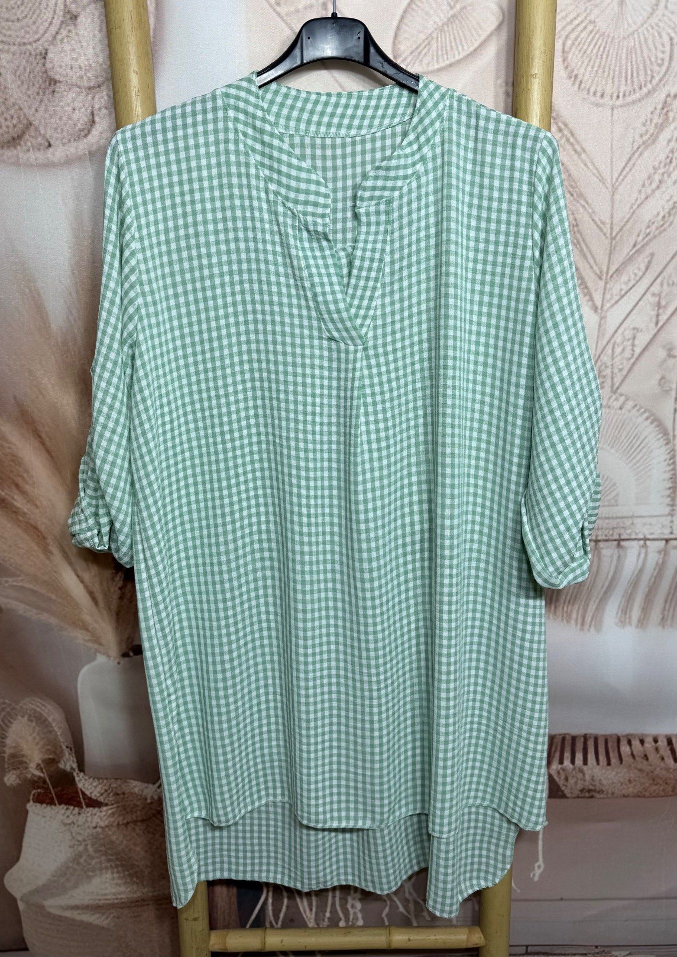 Tunique ou Robe courte Vichy Vert Menthe col Mao manches réglables du 38 au 48/50