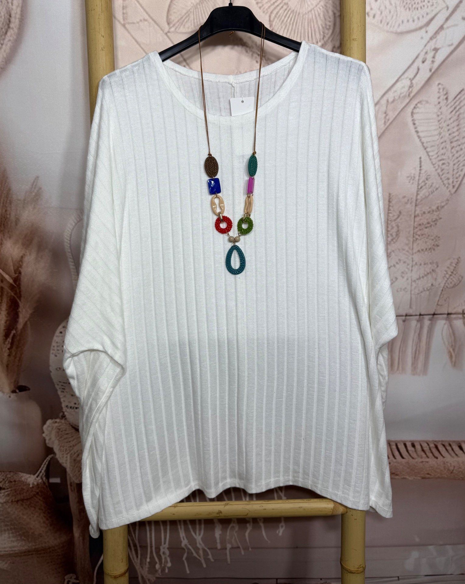 Tunique oversize côtelée blanche + collier douceur +++ du 42 au 58/60 et même +