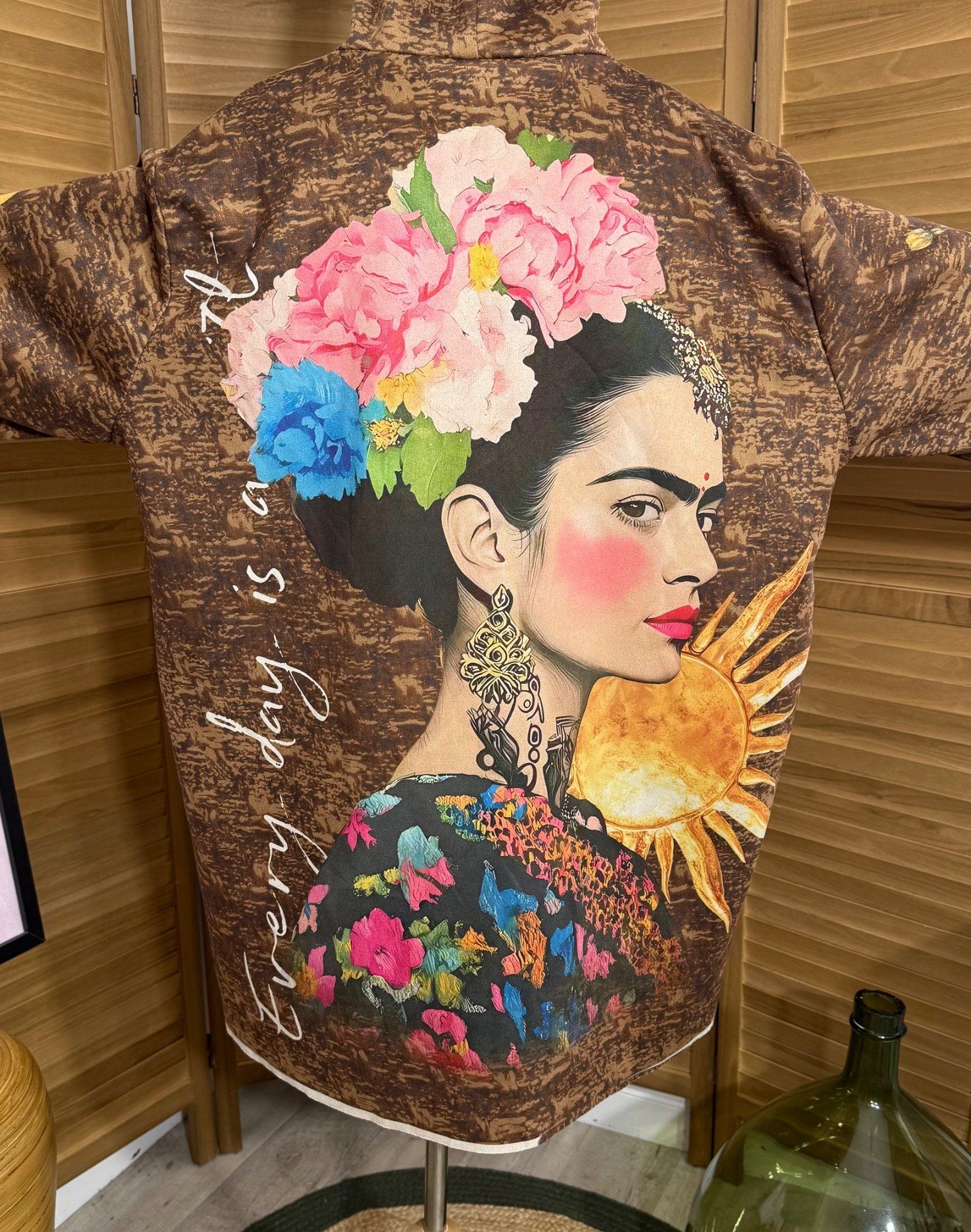 Veste à capuche suédine camel Frida Kahlo aux Fleurs
