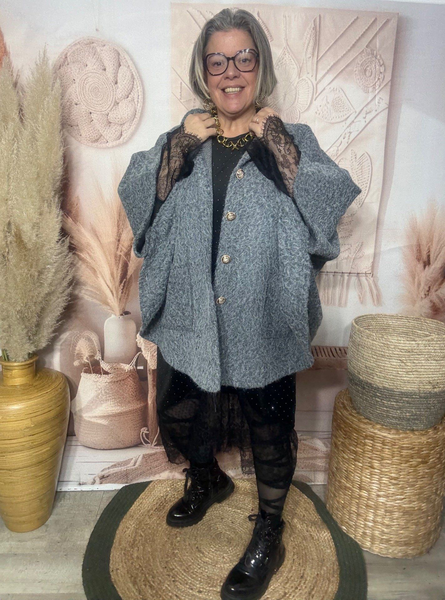 Veste-cape oversize laine bouillie gris perle TOUTES TAILLES jusqu'au 60 hiver +++