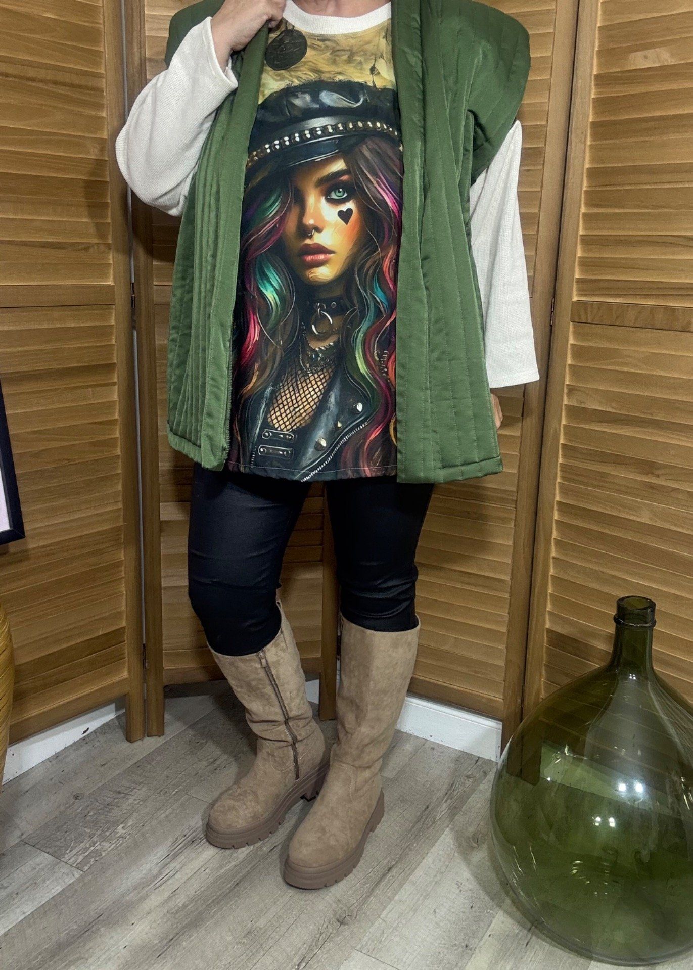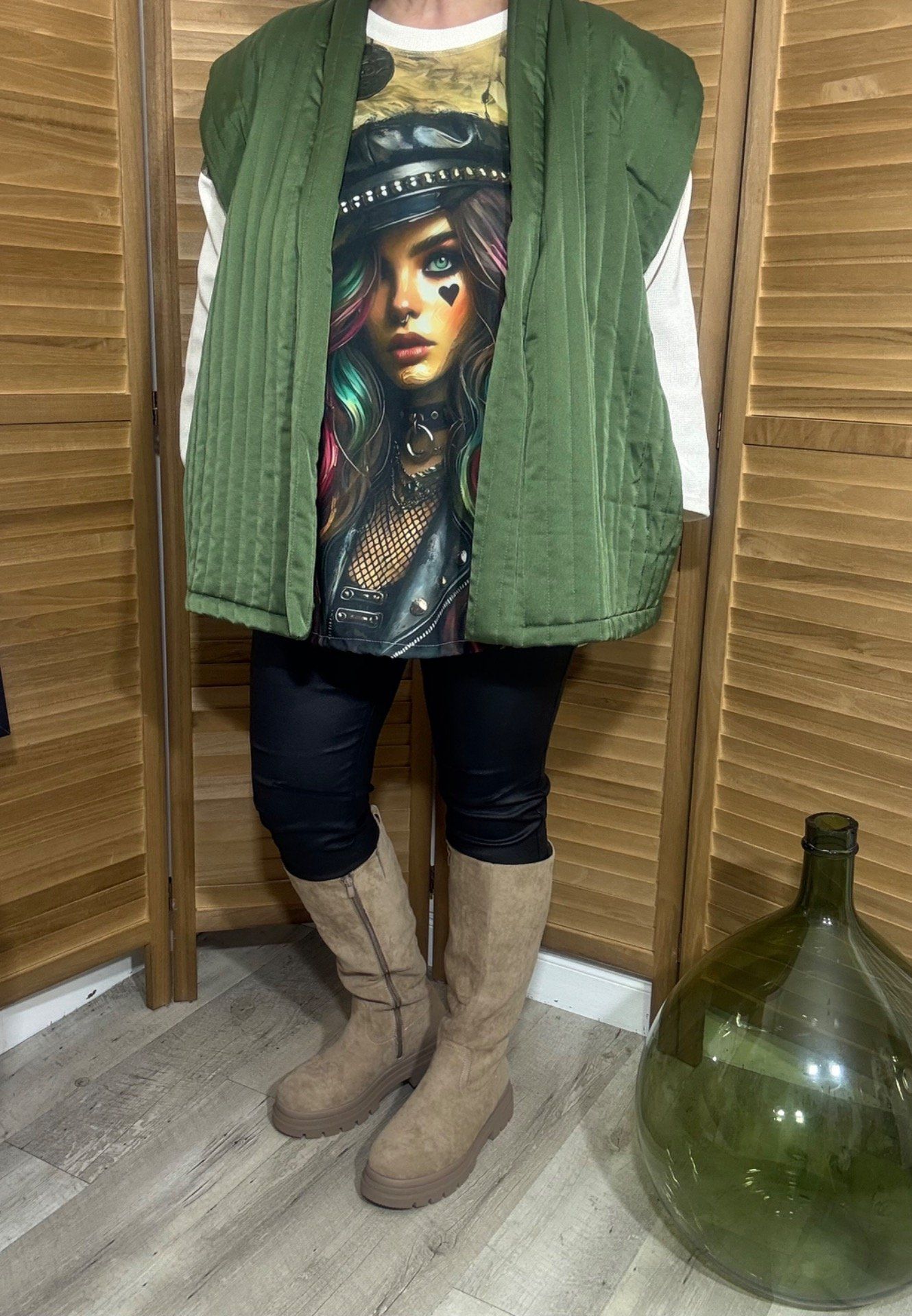 matelassée donc assez chaude pour l'automne et en hiver, en gilet sur un pull ou une chemise, elle sera aussi parfaite :-)