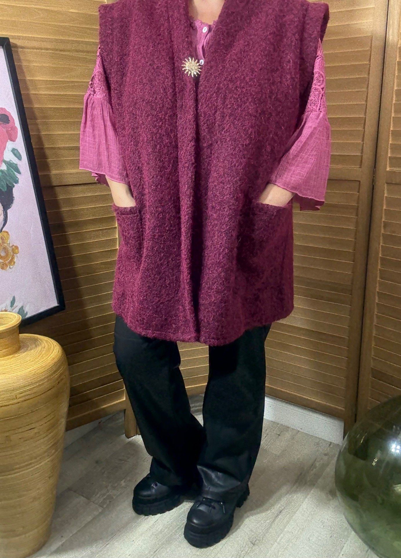 Veste sans manches façon gilet bouclette Bordeaux + broche dorée Soleil