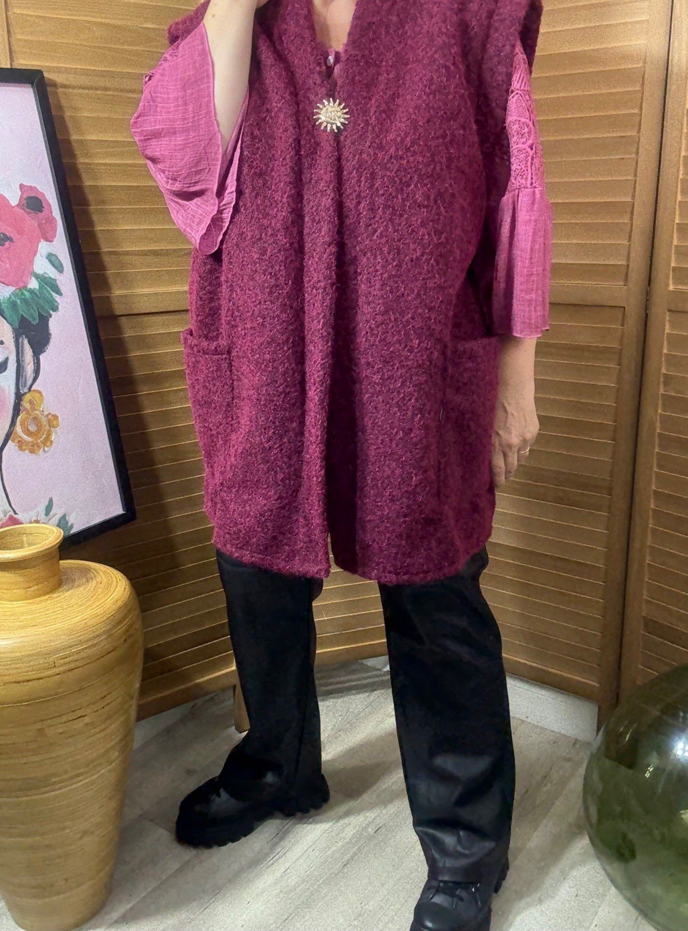 Veste sans manches façon gilet bouclette Bordeaux + broche dorée Soleil du 40 au 52 et même +